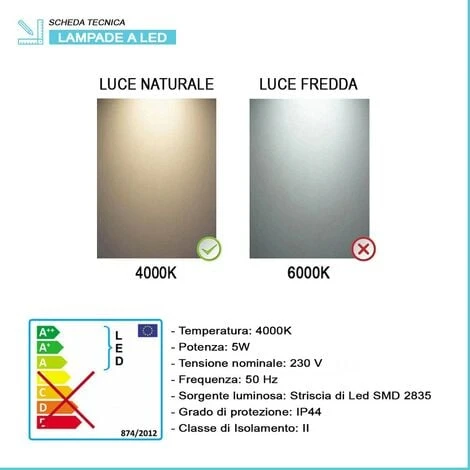 La luce a led presenta un colore naturale tipico della temperatura di 4000K, che avvolge il proprio arredo bagno in un’atmosfera calda e accogliente. È già incluso nella struttura dell’illuminazione specchio bagno il relativo trasformatore, che consente il collegamento della lampada alla rete elettrica senza l’ausilio di alcun alimentatore esterno. L’applique bagno viene inoltre facilmente acceso e spento tramite l’apposito interruttore on/off.