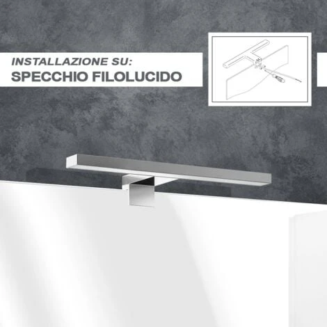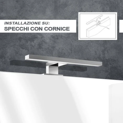 L’applique specchio bagno presenta una doppia modalità di installazione che la rende totalmente adattabile sia su specchi con cornice che specchiere a filo lucido.