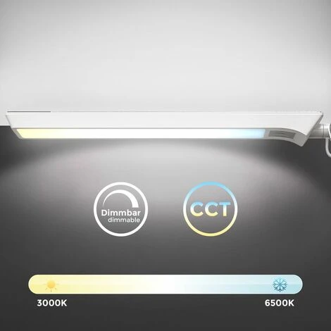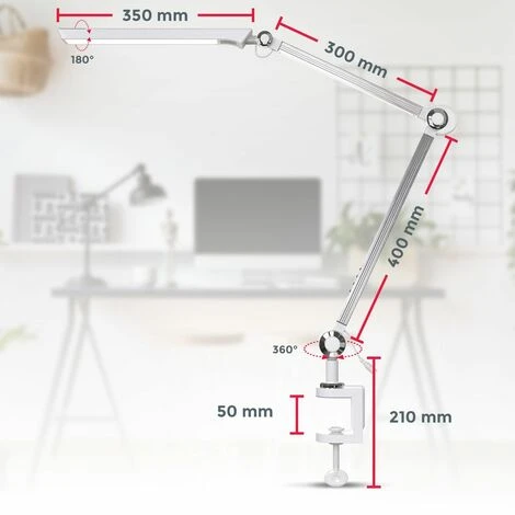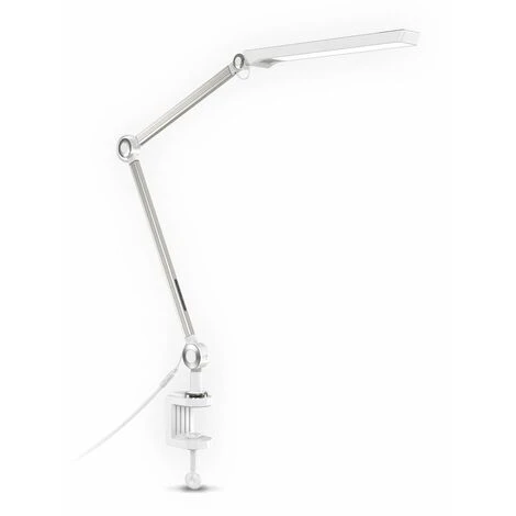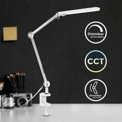 Riassumendo per voi: Lampada da tavolo a LED Temperatura colore selezionabile / CCT (3000K, 4000, 6500K) Dimmerabile in continuo larghezza di serraggio: 50mm Scheda a LED fissa da 9W 880 lumen Intensità luminosa Funzione di memoria Argento-bianco 667x703mm (HxP), 703mm (proiezione) 1328mm (lunghezza completa incluso il morsetto)