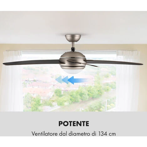 All’interno della raffinata struttura si trovano il motore del ventilatore, così come la lampada da soffitto in vetro smerigliato integrata. Entrambi i dispositivi possono essere usati in combinazione o singolarmente. Per attivare le funzioni si trova un comodissimo telecomando, che rende addirittura superfluo l’utilizzo dell’interruttore della luce. Come fonte luminosa possono essere utilizzate tutte le lampadine a incandescenza con attacco E14 fino a 60W, in modo da assicurare un’ottima illuminazione anche in stanze di grandi dimensioni.