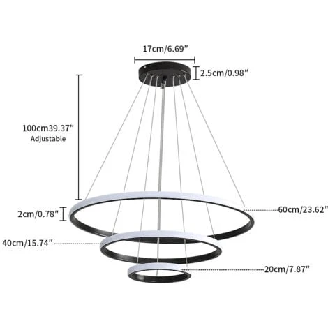 3. Dimensioni della lampada: 3 anelli /20 + 40 + 60 cm, la lunghezza del cavo della lampada: circa 1.5 m per la regolazione.