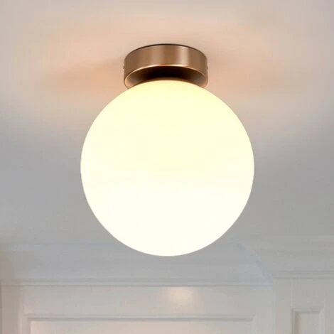 Lampada da soffitto Lenni in vetro bianco, per il bagno Il discreto supporto a soffitto di Lennie è nichelato, mentre il semplice diffusore a forma sferica è realizzato interamente in vetro. Questa lampada da soffitto per il bagno funziona con una lampadina con attacco E27. Si può tranquillamente optare per una lampadina LED retrofit ad alta efficienza energetica e di lunga durata.