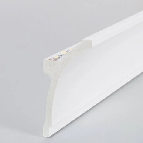 Questa modanatura dispone di uno spazio per installare una striscia di LED dalla larghezza massimo di 18mm. Permette una rapida installazione e la verniciatura della sua superficie. Può essere tagliata con una sega a mano, un seghetto alternativo o una troncatrice. Non pesa, mantiene l’uniformità del prodotto, molto resistente, non può essere piegato. Per la sua installazione è necessario solo un adesivo di tipo polimerico.