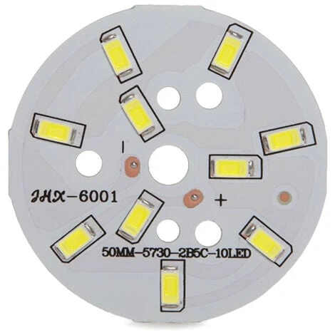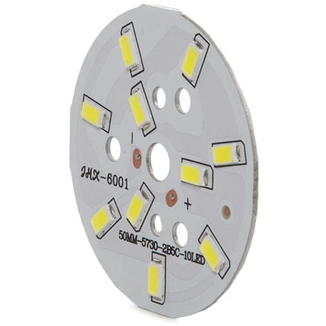 Questo modulo dispone di 10 LED SMD5630 ad alta potenza. Sono montati su una piastra circolare in alluminio da 50 mm, spessore 1,2 mm. Questa piastra collabora alla dissipazione della temperatura.