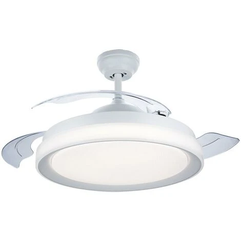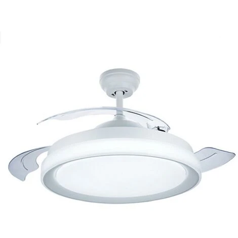 Non più ombre roteanti sul soffitto: questo ventilatore ha delle pale trasparenti che possono essere ripiegate verso la lampada e nascoste dalla vista quando non in uso.