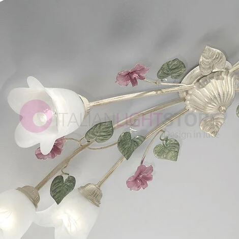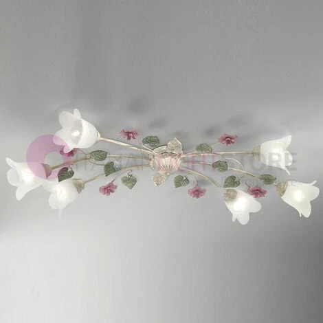 Lampada da soffitto a 6 luci con struttura in ferro sagomato, verniciato avorio e decorato a mano con sfumature oro (particolari verdi e rosa), diffusori a forma di fiore in vetro alabastro bianco. SPRING è una linea completa di lampadari, lampade da soffitto, da tavolo e a parete, ideale per illuminare con originalità e un tocco di colore cucine, saloni e camere in stile classico, rustico o country chic. ELETTRIFICAZIONE: E14 – 6 X MAX 40W Lampadine non fornite (possono essere utilizzate lampadine a basso consumo o led con attacco a vite mignon E14). CLASSE DI PROTEZIONE: IP20 (per interno); DIMENSIONI: Diametro 100×43 CM. – Altezza 20 cm. Produzione 100% Made in Italy.